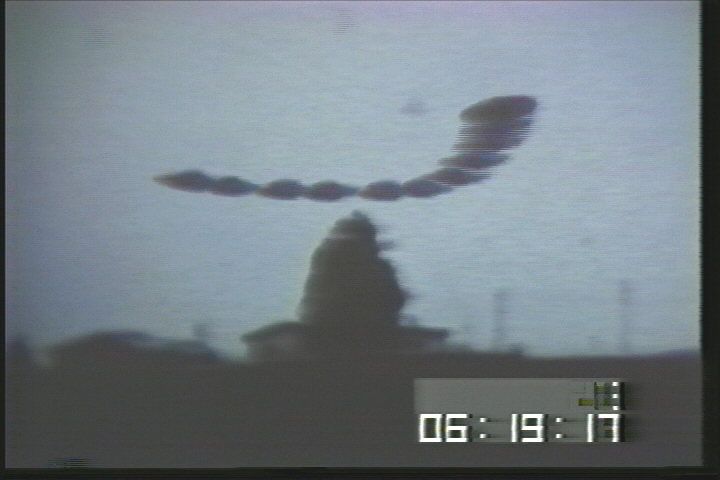 | Fig. 12, above: Frame from Genesis III's video "Beamship: The movie footage" 2.7 sec later, when the craft was near the end of a longitudinal swing away from the camera. |