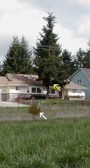 | Fig. 9. Section of a photo taken in western Oregon in March. Tiny tree in foreground and large tree in background denoted by arrows. |
