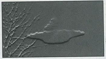 Wendelle Stevens was one who looked at the film from the point of view that it might not have been a model UFO, and found some points to corroborate this view. "On three occasions the spacecraft changes its motion abruptly with no change in the tilt of the vertical axis of the ship. If it was in fact tethered, one would expect the vertical axis to tilt as the tether point above was moved" (Stevens, 1982, p. 280). I was much impressed that on one occasion the craft came to an abrupt halt and hovered absolutely motionless above the tree top for up to 20 seconds (Deardorff, 1989); a model suspended from a long pole by a 14ft string would inevitably exhibit noticeable wobbles and/or small bouncing vertical motions exceeding 5% of the model's width. Even if three accomplices were aiding in a hoax by pulling taut from opposing directions on long horizontal lines attached to the alleged model, this would not eliminate small vertical motions.
