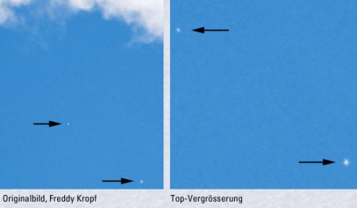 After a few minutes of quiet observation we called the people who sat in front of the house -- and within a few minutes, our group of two had grown to a proud 17 persons. The first Aahs and Oohs came already soon after telling them to search the sky. Freddy Kropf immediately rushed up with his camera and began to photograph with the device, which was equipped with a 500 mm telephoto lens. The Aahs and Oohs became still more intense when, a little later, I could make out a second object of almost the same size to the right of the big cloud and pointed out this observation.