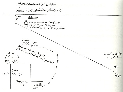 The night was still half dark when, in the early morning of March 13, 1999, I left the house in order to drive my friend, Christian Krukowski, to the airport at Kloten. It was around 06:20 hrs. As I stepped out of the house, my attention was immediately attracted to a bright light in the sky, which at first was shining like a lamp. Somehow it then came to me, however: How could a lamp shine in the sky? Such a thing was impossible. Then I noticed that the light, which was about three times bigger or brighter than the brightest known star -- Venus, moved along slowly and completely silently towards the east and approached us. Symmetrical, bright and big, it remained flying in a straight flight path.