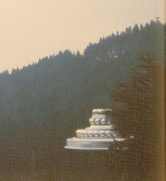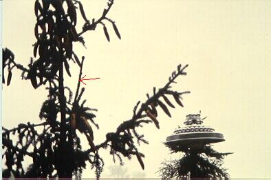 Wedding-cake craft partially eclipsed by large fir tree. Only after the English version of Meier's Fotobuch came out did I become aware of his photo #850 as published in Through Space and Time: A Photo Journal of "Billy" Eduard Albert Meier (Tulsa, OK: Steelmark LLC, 2004, p. 114). (Meier's "Verzeichnis: Authentischer Farb-Photos" gives the date as 4 April, 1981, apparently in error.) See Fig. 10. This was in the hills in the general vicinity of the villages/towns of Auenberg, Egg, Girenbad and Hinwil, some 15 miles ESE of Zurich. Meier shot it around 2:30 pm, April 3, 1981 while standing on the top of his van, according to his 1999 Verzeichnis. One can see 5 or 6 separate main branches of the tree eclipsing most of the right-hand side of the craft, with more of its branches extending out to the tree's left side above the craft on up to the tree's top. According to Dr. Edward C. Jensen, Associate Dean for Academic Affairs, Elizabeth P. Ritchie Distinguished Professor, Forest Ecology and Natural Resources Education, Oregon State University: