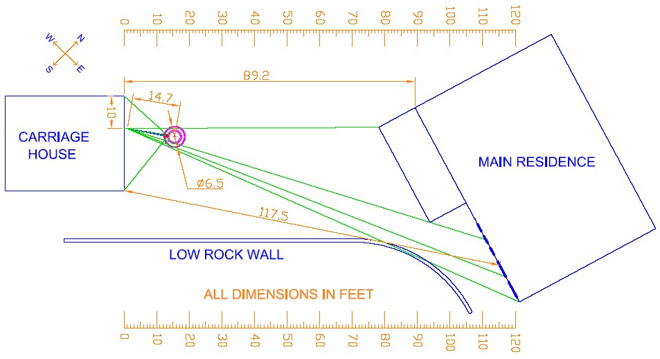 Distance of the wedding-cake craft from the carriage house. Using the ray-tracing technique, one may obtain a fair estimate of this distance. The camera level was about the same as that of the lower tier of spheres in photo #800, so that one may examine the image of the carriage house – its width – as it appeared at or near the "equator" of one of the closest spheres. The rays from the two sides of the northeast wall have already been drawn into Fig. 3, where they reflect from the closest sphere back to the camera.