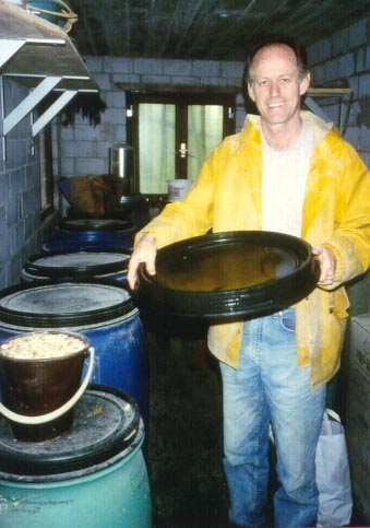 17. A visitor (Philip McAiney) at Meier's residence holding up garbage-can lid, circa 1998. |