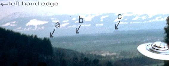 In discussing this photo-series, we need to mention one of the beamship photos (#25) that Meier took earlier, on 27 February, 1975, from about the same location (Korff, 1995, pp. 161,188,193). In that photo, Fig. 10, the tree in question does not appear, whereas the same forested hill in the middle background does appear in photos #65 and #119 (see Fig. 4); Korff considered this proof that the tree had never existed. However, it will be shown below that for photo #25 Meier had stood farther to the southeast than for photos #65 and #119, and had not pointed his camera far enough to his right (towards the northwest) to have allowed the tree in question to appear.