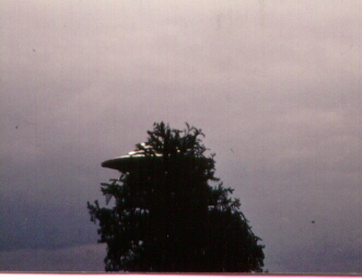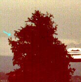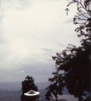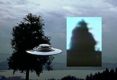 PHOTOGRAPHIC TRICKERY?  In the photos of Figs. 7 and 8 below, we see the UFO directly behind and within the upper part of the tree.