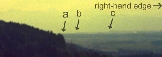 Arrow (a) points to a distinctive jump in the far foreground tree line, and arrows (b),(c)