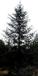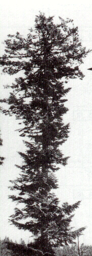 THE TREE'S MATURITY.  In 1985 I showed the photo that best displays the tree's trunk (#66), plus another of this series, to two professors of Forest Science at Oregon State University to determine if they could identify the type of tree. These were Profs. Richard. K. Hermann (now retired) and Edward. C. Jensen. Hermann was raised in western Germany and was very familiar with this species of tree. With certainty they stated that it was a mature abies alba, i.e., a European silver fir. Other forestry experts contacted more recently were less unanimous about the species identification, with picea abies (Norwegian spruce) suggested as an additional or secondary possibility (Hanley, 2001; Hansen, 2001; Holdenrieder, 2001). However, none suggested that it could have been a small potted tree or model tree. Thus it was no mere 1- or 2m tree, which would exhibit an unmistakably juvenile appearance in its profile, density of branches and trunk, as will be discussed soon. Prof. Hermann pointed out that its crown was already showing signs of “stork-nesting,” or near cessation of vertical growth, due, they presumed, to the environmental stress of excessive smog east of Zurich and/or to acid rain. A potted, “baby” tree is far too young to exhibit such effects.