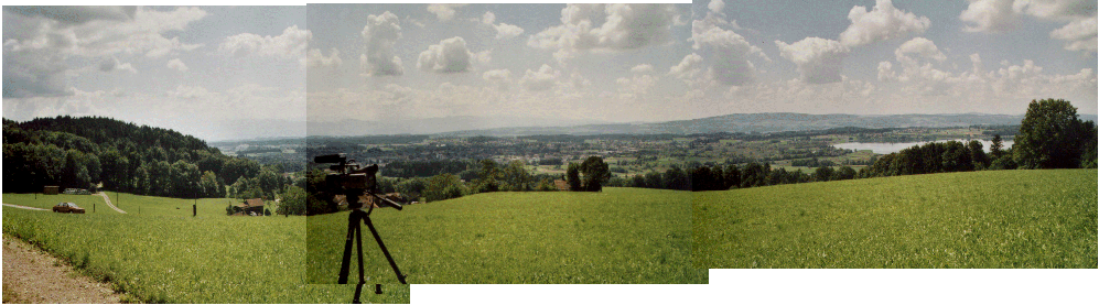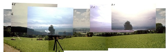 A wooded area lay behind him. The lowest portion of the tree's trunk had not been visible, due to the increasing slope of the hillside in the downhill direction, as can be seen in Fig. 3, a recent panoramic view. (The fact that the tree itself is no longer existent is discussed further on.) In Fig. 4 below it we see several of Meier’s photos superimposed upon the landscape panorama, such that the most distant background matches. The total azimuthal range of the tree as viewed by Meier's camera is estimated at 85° (with Meier's photo #65 showing the tree as viewed when he had walked farthest to the northwest, and #69 showing it when he had walked farthest to the southeast). We discuss this particular aspect because it was claimed (Korff, 1995, p. 178) that the various vistas taken in by Meier’s camera encompassed a minimum of 180° of azimuth during this series of photos, in which case the vistas of the tree would have varied by some 135°. From this claim, and the prominent gap seen on the left in the tree’s branches near its top, Korff concluded that Meier (for unknown reasons) had rotated a potted baby tree with a model UFO attached before shooting each photo in order that the same side of the potted tree always face the camera. However, a hoaxer using a potted tree would not likely take any such action that would later give away his fraud.