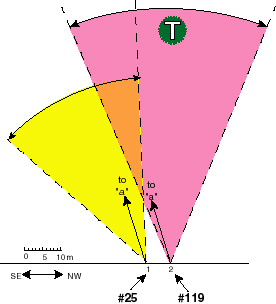 A plan-view diagram of the layout is shown in Fig. 13. In constructing it, care was taken to properly position the edges of the photos relative to point "a" in #25 and #119, and also the location of the tree, which was some 66 meters from the camera for a beamship width of 7 meters. The 45° arc of each photo's field of view is indicated. We see that when taking photo #25, Meier’s camera would need to have been swung at least 5° to the right in order that the left-hand edge of the abies-alba tree just barely appear in view. Thus, there is no basis whatever for the claim that the vanishing tree had not been existent in February, 1975. Yet, it is a conclusion a negative skeptic could easily jump to if not interested in looking into the details.