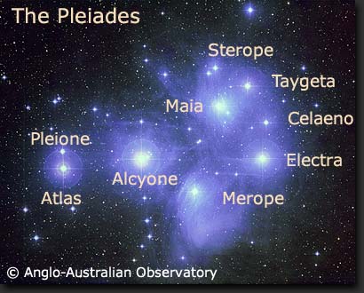 Only the brightest six or seven are visible to the unaided eye, and these have acquired the names indicated in the photo. The Pleiades would seem to be a most improbable region of the heavens for extraterrestrials (ETs) to come from, to have a home in. Most of the stars in this cluster are deduced to be only some 100 million years old, which is far too young to have allowed advanced life forms to evolve. However improbable it may seem, traditions of many cultural groups say that their ancestors came from the Pleiades. These include the Incas, the Iroquois, the Lakotas, the Cherokees, the Navahos and the Hopi. The Pleiades, and their star names, are also rooted in Greek mythology. Eduard Meier was eventually informed by his ET contactors that they came from a space-time dimensionally shifted form of the same Pleiades, whatever that may mean. If so, many surprises lie ahead of us, in the next several millennia, as our science and technology progress and evolve along with our spirituality, hopefully, and allow us to understand such matters.
