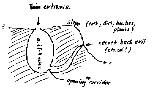 The tomb is recollected to have been 3.5 to 4 meters in length; the outside slope of the hill is labeled as having been covered with rock, dirt and bushes. In the rear of the tomb there was a narrow tunnel leading out to what had once been a second entrance, long since blocked with earth. This smaller, second entrance would have faced out onto the slope around a bend from where the tomb's main entrance had been. This was the entrance/exit through which Jmmanuel received medical attention from Joseph and some Hindu friends he had sought out, and from which they exited very early in the morning three days later, according to the TJ.